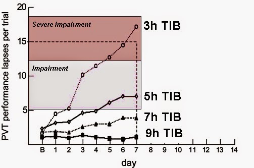 有個研究找了一群人,讓他們分別每天能躺床睡9,7,5,3小時,連續七天,看他們每天注意力變化的情況。注意力是以Psychomotor vigilance task來加以評估,這是很常用來評估睏睡與警覺度的作業,方式是在電腦螢幕上出現一個點,要求參與者一看到亮點的出現就立刻按下按鈕,越快越好。